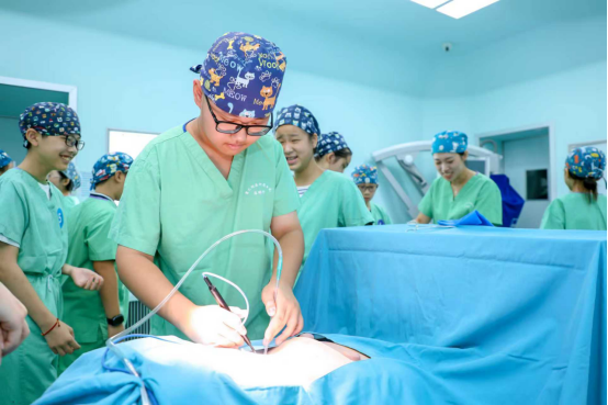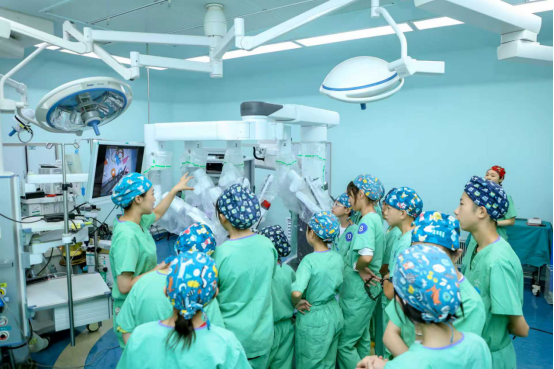 外科大楼手术室,平日严谨的医疗空间,成了孩子们好奇探索的“新领地”。杨静护师对小朋友们说“大家看这个屏幕上跳动的数字(指向监护仪),这是心率,这是血压,手术时它就像‘千里眼’,实时盯着患者的生命体征,一旦有异常,我们能立刻发现”“这个是 3D 腹腔镜,能把手术部位高清呈现在屏幕上,让医生看得更清楚,操作更精准?!痹揭缴缸糯锓移媸质趸鳎骸翱杀鹣滦】凑馓ɑ?,它的‘手腕’比人类灵活 7 倍,能完成 0.1 毫米精度的操作,很多复杂手术靠它就能减少创伤!”当“达芬奇手术机器人” 展现在眼前,孩子们瞬间被这个“机械伙伴”吸引。“它的手臂能精准操作,眼睛能放大手术视野!”随着医护人员讲解,孩子们围在机器人旁,摸摸机械臂、看看显示屏,直观感受医疗科技助力“救死扶伤”的奇妙。这场探秘,让孩子们对医生职业有了具象认知,科技改变生活,科普惠及万家。
